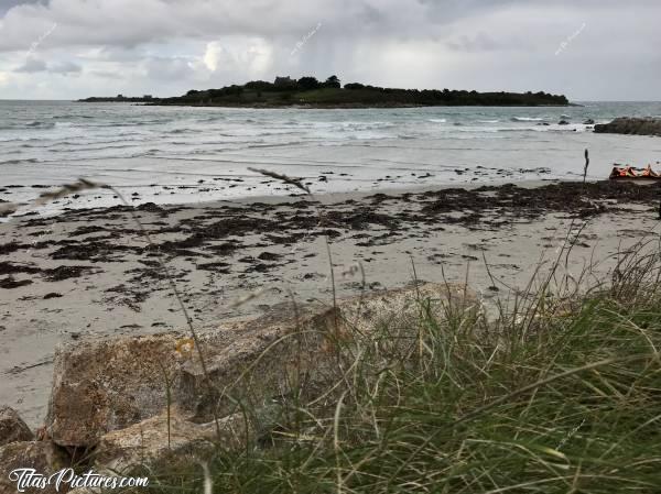 Photo Le Dossen : Plage du Dossen à Santec, avec l’île de Siec en face (ou Île de Sieck - Y’a 2 écritures). Cette île est accessible à pied à marée basse par grande marée. Mais faut pas se louper sur l’horaire pour revenir sans se mouiller 😅c, Plage du Dossen, Santec, Île de Siec, Goëmon
