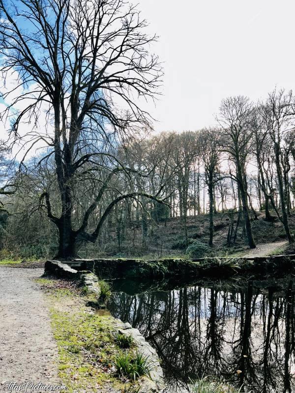 Photo Le Bois de Keroual : Encore une retenue d’eau et ensuite, c’est la chute 😅 Quelle drôle de forme pour cet arbre 😧c, Bois de Keroual, Guilers, retenue d’eau, arbres